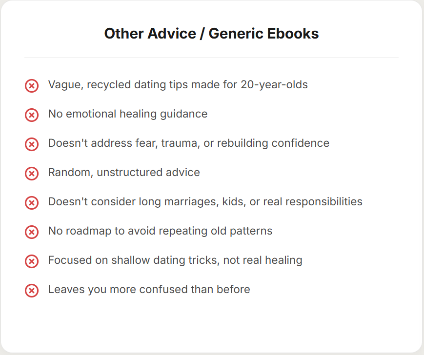 Most dating advice online is generic, shallow, or aimed at people in their 20s. Divorced adults have lived real life. They’ve loved deeply, been hurt deeply, and carry responsibilities younger daters don’t. This guide goes deeper: rebuilding identity, healing old wounds, learning boundaries, choosing healthier partners… Google doesn’t give you that level of emotional clarity.